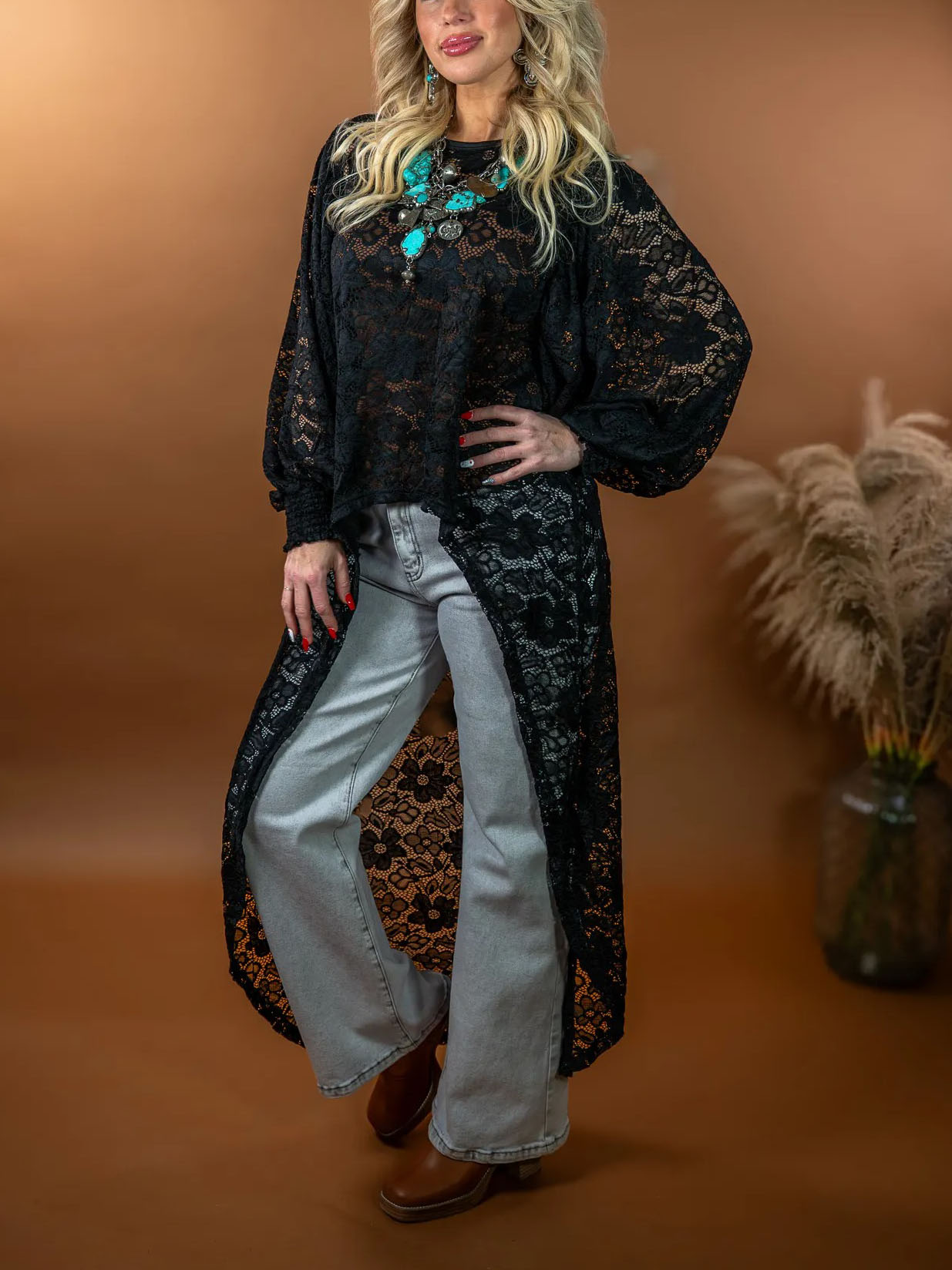 Embrace effortless bohemian charm with this black lace longline blouse, crafted from intricate floral lace fabric. It features oversized puff sleeves, a relaxed fit, and an asymmetric longline hem (extending to midi length) for layered styling. The sheer lace design adds soft texture, making it perfect for casual outings, boho-themed events, or adding a romantic touch to everyday looks.
