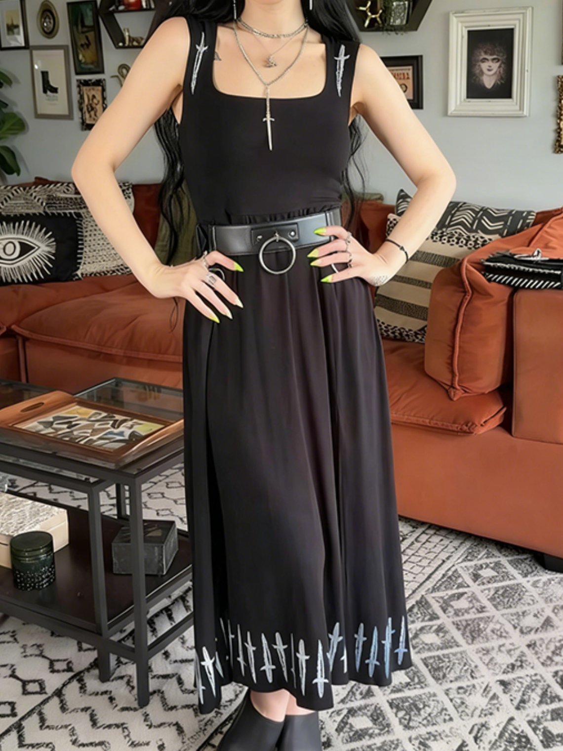 Material and Details: The main body is crafted from a smooth, black knit blend fabric that feels soft and lightweight against the skin. White dagger embellishments adorn the shoulder straps and hem, adding a touch of dark retro style to the otherwise simple black dress, resulting in a subtly distinctive and individualistic look.