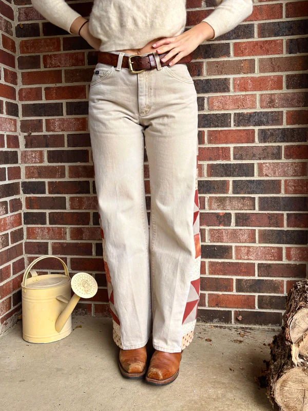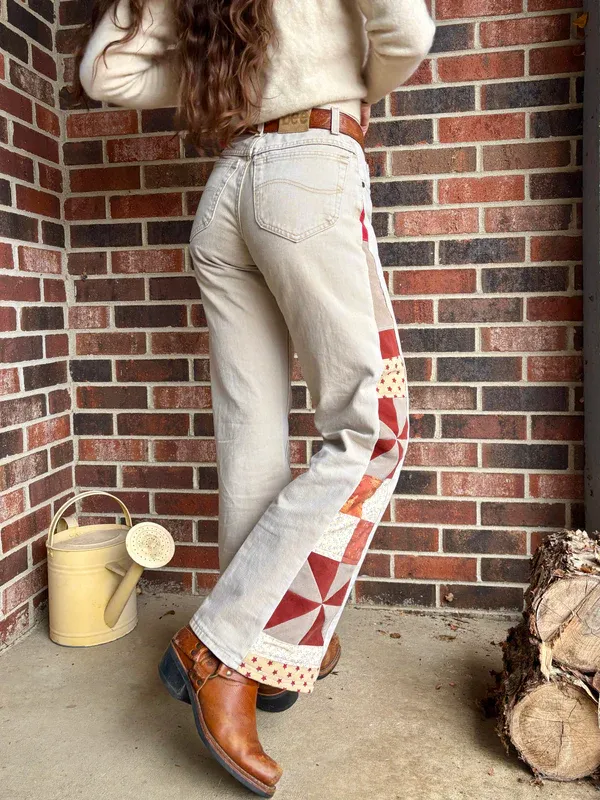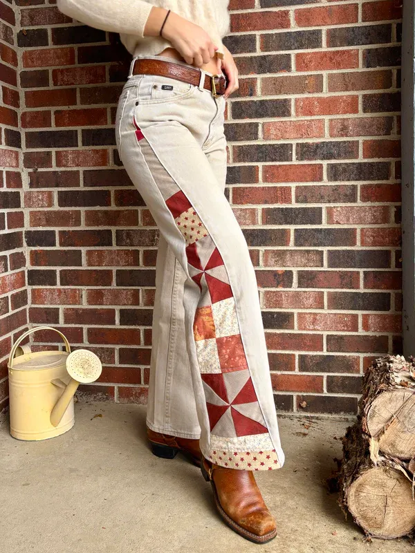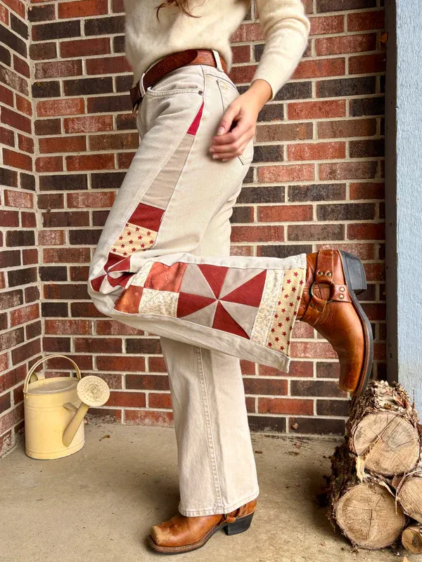 - Quilt star and pinwheel panel on side legs, constructed out of salvaged denim fabric