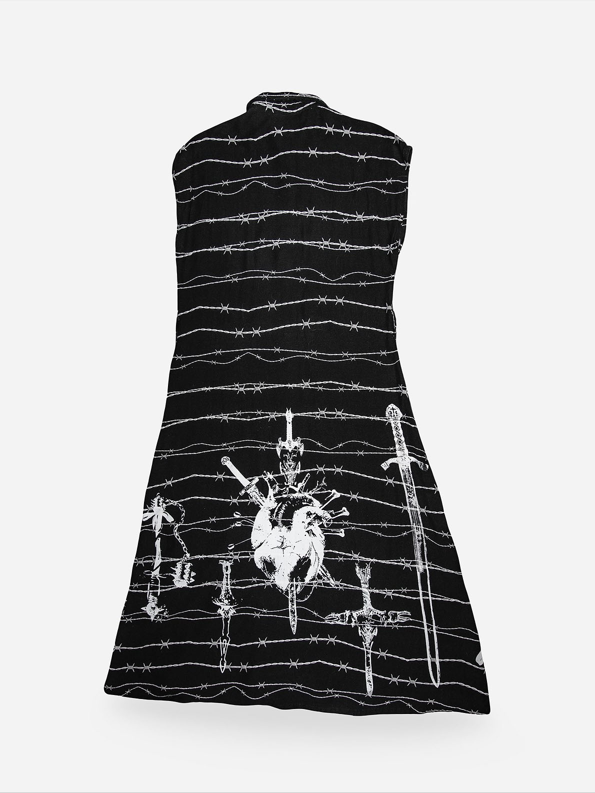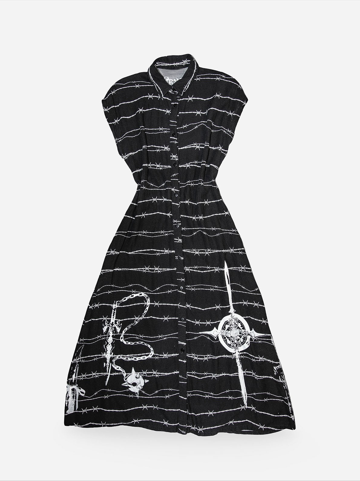 Design: All-over barbed wire + gothic symbolic prints; button-front closure; short sleeves; relaxed midi silhouette; detachable studded belt