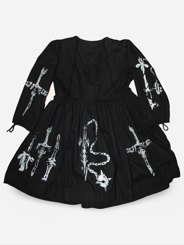 Design: Medieval weapon & symbolic prints; keyhole tie neckline; puff long sleeves (cuff ties); elasticated gathered waist; mini silhouette