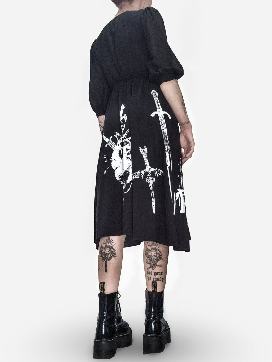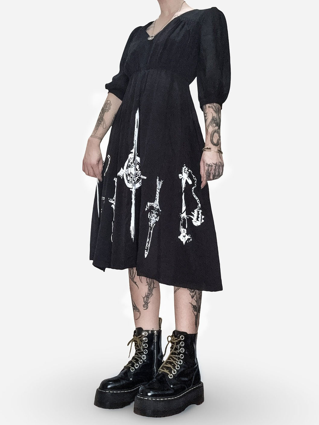 Embrace dark medieval gothic style with this black midi dress, featuring bold prints of occult symbols (cross motif) and medieval weapons (swords, chains) paired with symbolic imagery (snake, skull). It’s crafted from lightweight woven fabric, and has a V-neckline, puff three-quarter sleeves, and an elasticated waist for a flowing silhouette—blending edgy occult charm with feminine elegance. Perfect for gothic-themed events, alternative fashion outings, or edgy everyday styling.