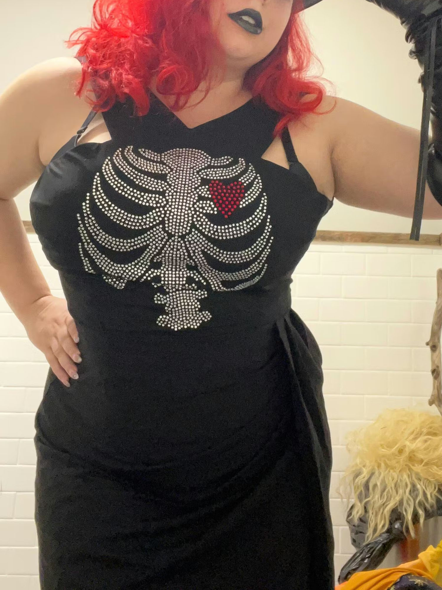 Embrace edgy gothic glamour with this black maxi dress, crafted from smooth stretch fabric. It features a striking crisscross halter neckline, a fitted silhouette, and a high slit—plus a eye-catching skeleton + red heart sequin embellishment on the bodice. The sleek design blends dark gothic symbolism with subtle sparkle, making it perfect for gothic-themed parties, evening events, or bold casual styling.