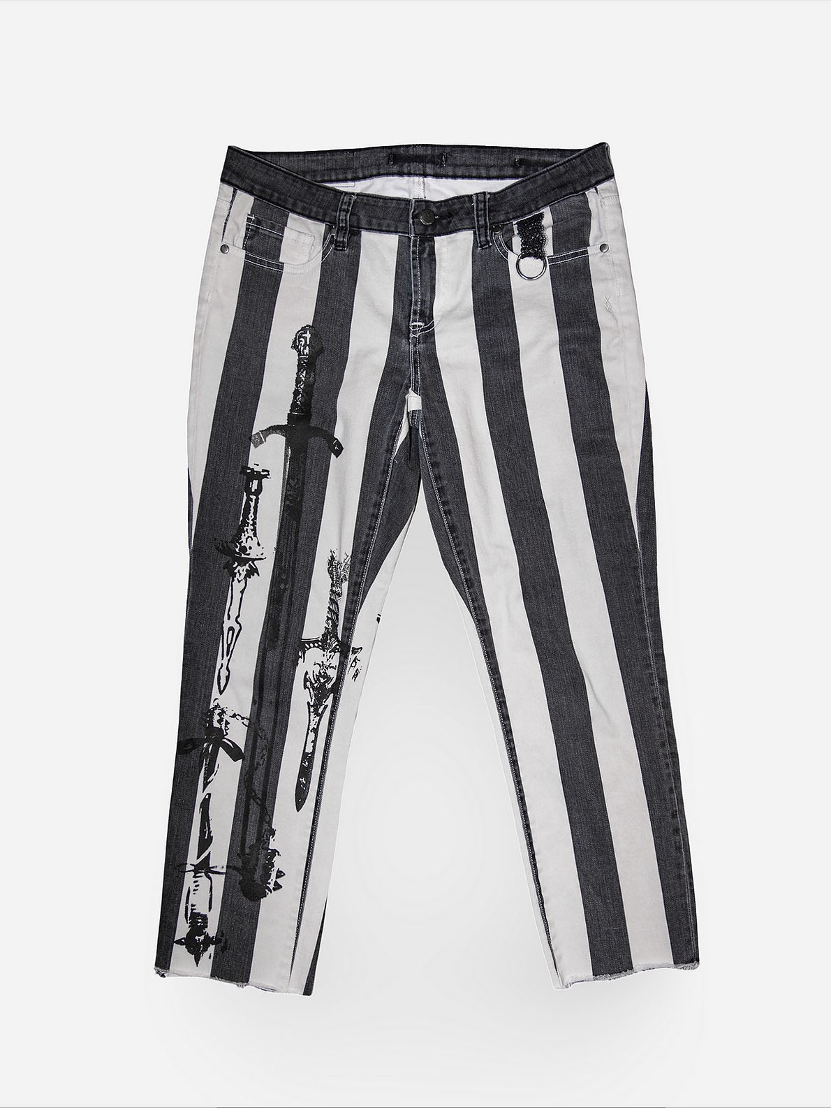 Design: Bold striped base; medieval weapon & symbol prints; frayed hems; detachable pearl chain; slim skinny silhouette