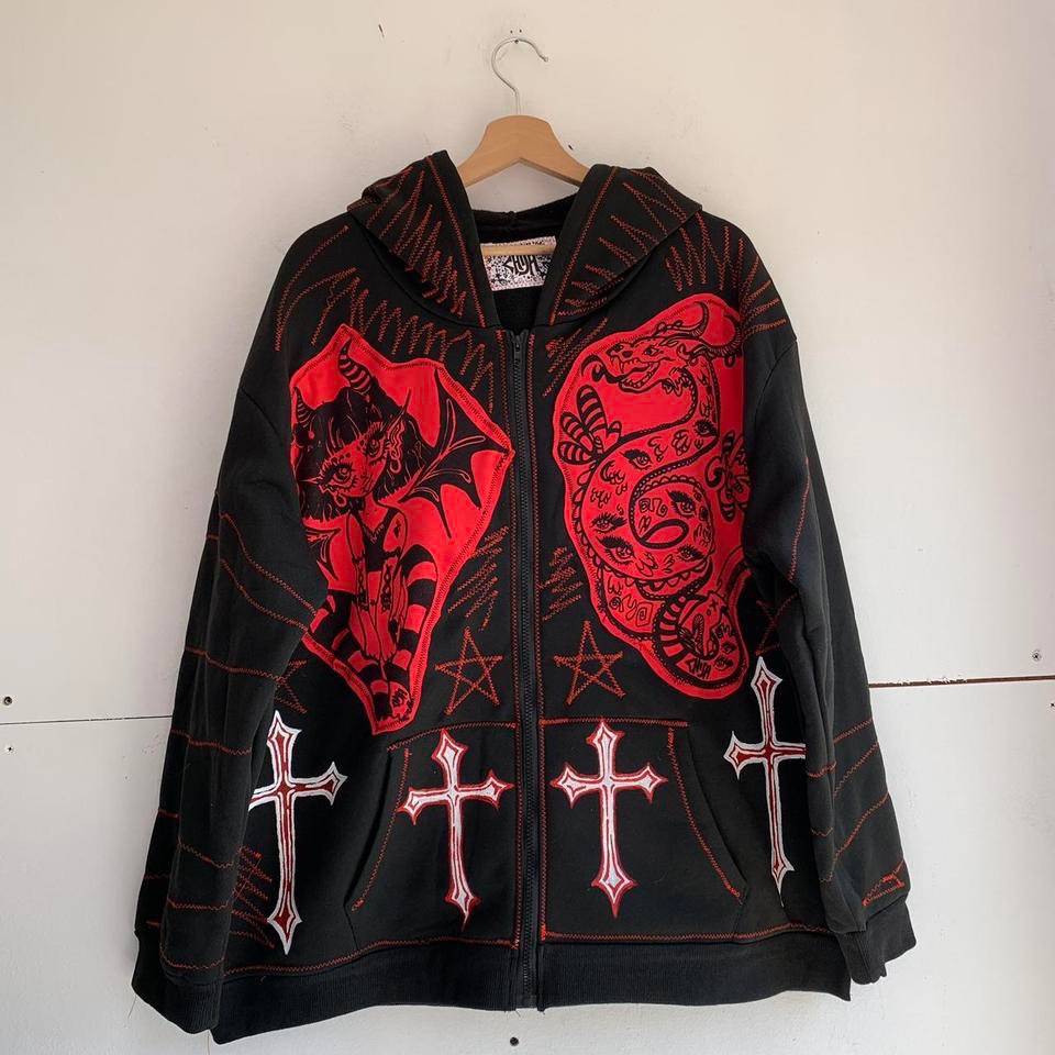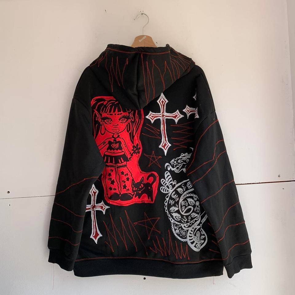 Pattern and Details: Primarily black and red with white decorative elements—the front features a dark, pointed-eared girl and a snake motif printed on either side, with a pointed cross pattern at the hem; the back features a complete dark girl (with tattoo details) + a black cat + snake motif, incorporating five-pointed stars and red stitching. The dense gothic elements create a dark and rebellious overall style.