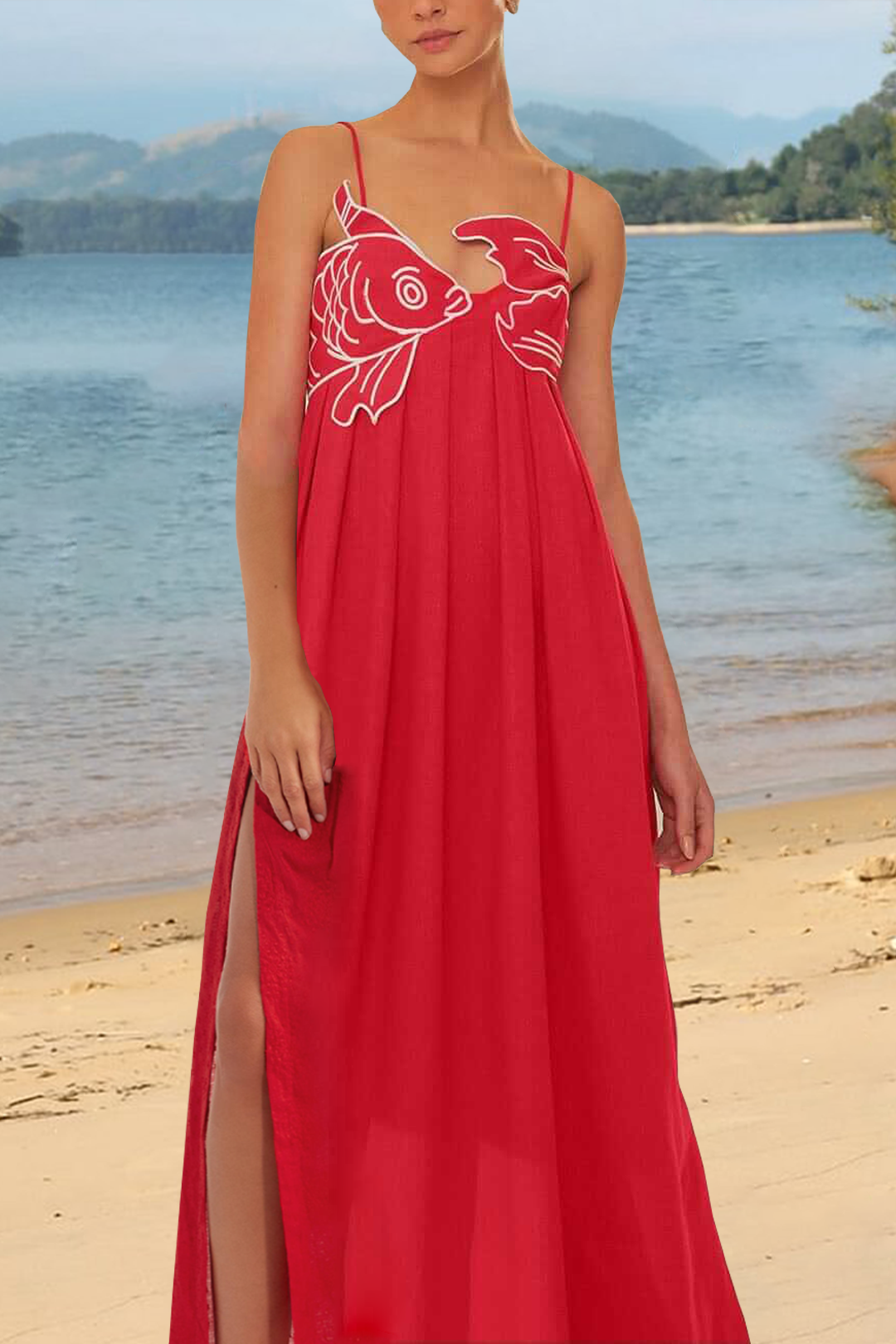 The Red Fish Top Maxi Dress captures playful elegance with its vibrant red hue and whimsical fish embroidery. Its flowing silhouette and unique asymmetric neckline offer a breezy yet refined look, perfect for sun-soaked days and balmy evenings. Embrace the joyful energy of this dress for a touch of tropical sophistication.
