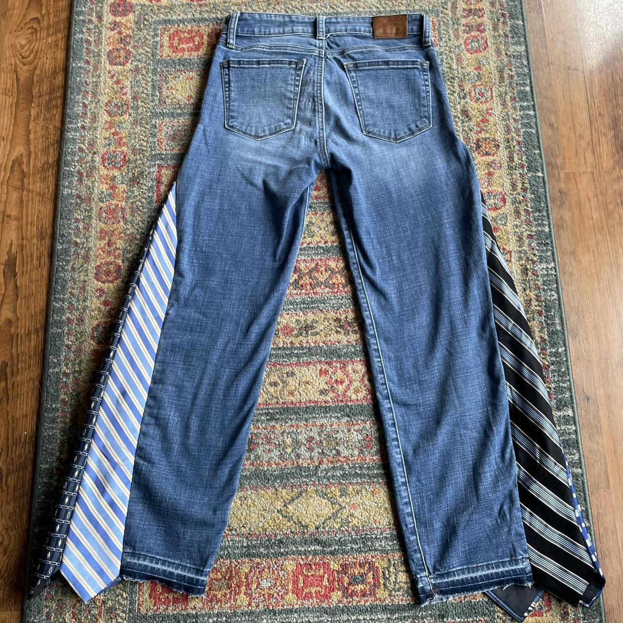 Material: Vintage-wash light blue denim + mixed stripe fabric panels